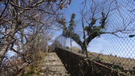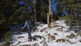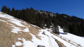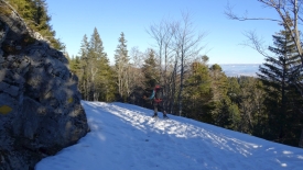Au passage du mur, nous enlevons les raquettes et restons à pied le temps d’arriver au col, le sentier étant particulièrement en dévers. Par endroit, il est en plus herbeux, la pente étant orientée plein sud.