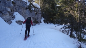 Garés au pré de Bière, les premiers pas dans la neige nous forcent vite à retrouver un semble de sentier. La neige est molle comme jamais et nous nous enfonçons d’une dizaine de centimètres.