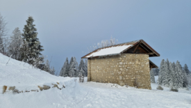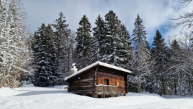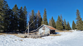 Les volets de la fenêtre-porte de La Glutte sont ouverts et, devant, 4 paires de raquettes sèchent au soleil. De la fumée sort de la cheminée. Indices évidents d’une présence humaine.