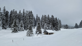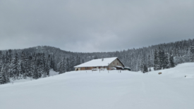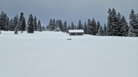 Nous rejoignons ainsi le pré aux Biches, et son petit couvert, magnifiquement solitaire sur une immense étendue neigeuse.