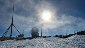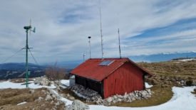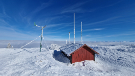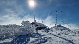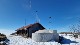 Les pales de l’éolienne presque immobiles, les panneaux solaires sous la neige laissent présager un niveau de batteries au plus bas.