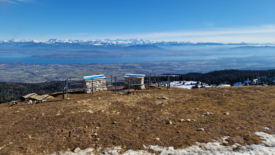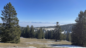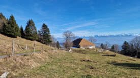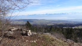 Nous profitons de la belle terrasse en bois, face au soleil, et jouons aux lézards. En face, la chaîne des Alpes et le bassin lémanique, brumeux. Plus près, du côté du chalet de Ballens, des voitures sont garées.