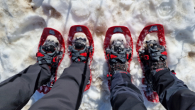 Nous sommes bien couverts et, somme toute, la balade reste agréable, même si très silencieuse. Entre le vacarme du vent, le crissement des raquettes dans la neige, chaque phrase doit être répétée deux à trois fois pour être intelligible.