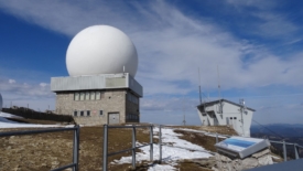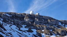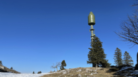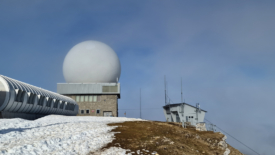 La pointe de l’antenne de La Barillette et la chaîne des Alpes.