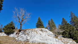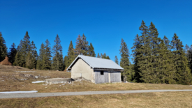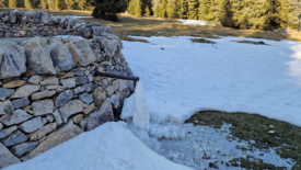 Pour arriver à La Corne, nous prenons notre raccourci habituel qui coupe par le petit pré. Il a en plus l’avantage de nous garder au soleil alors que la route traverse la forêt. Puis, très vite, nous laissons le sentier qui monte vers Druchaux et l’Aurore pour longer le mur qui délimite la partie nord-ouest des Râpes. Ce qui nous mène à la cabane des Yarpes, pour le pique-nique.
