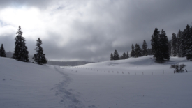 Nous partons d’un bon pas, appuyant plus que nécessaire sur les bâtons pour faire travailler nos épaules et contribuer ainsi au réchauffement du haut du corps. Je réclamerai mes gants un peu avant d’arriver au mur qui marque l’entrée du pré de la Foirausaz.