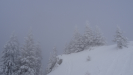 Arrivés sur le pré de La Foirausaz, nous apprécions un petit échantillon de ce que sera notre journée. Neige soufflée, rugissement dans les oreilles et conversation impossible à cause du bruit ambiant.