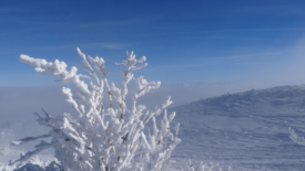 La montée finale vers La Dôle se fait en longeant le mur, dont seules les pierres faitières dépassent. Le téléski de Cuvaloup est arrêté, les câbles recouverts d’une épaisse couche de givre. Le télésiège fonctionne, mais l’affluence est réduite. Seuls un siège sur trois ou quatre est occupé.