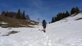 La montée se fait en évitant les plaques de neige.
