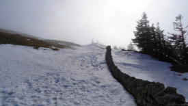 Les nuages, en provenance de la vallée de Joux viennent masquer le soleil. La montée finale vers la boule de La Dôle suit le mur, pour profiter de la neige qui s’y est accumulée.