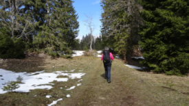 Petite balade au départ du lieu-dit Les Plattets, au-dessus de Bassins. La première partie de la balade se fait par une route forestière que nous n’avons jamais fréquentée. Puis nous rejoignons le sentier qui monte à La Dunanche. A l’ombre, contrairement à nos attentes, la neige est encore bien présente, même si nous sommes à basse altitude.