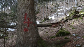 Le sentier qui monte du Vuarne à la Pointe de Fin Château a été récemment balisé. Par de grands traits de peinture rouge. Sur des troncs d’arbre, des numéros…