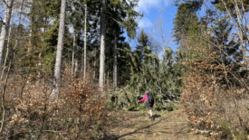 Le soleil est au rendez-vous (pour l’instant) et la température beaucoup trop élevée pour un mois de janvier… Nous partons en direction de Le Vaud sur une piste forestière massacrée par des engins forestiers… Nous constatons de plus en plus souvent le carnage qu’ils laissent derrière eux. Entre routes et sentiers défoncés, amas de branches laissés à l’abandon, leur empreinte est faite pour durer.