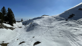 Etant un peu incertains quant à l’enneigement, nous choisissons de monter à la pointe de Fin Château, sachant que la pente est à l’ombre. La montée, déjà exigeante, est rendue compliquée par la neige transformée et absente à certains endroits. Les traversées en dévers sont difficiles et requièrent une attention toute particulière.
