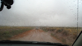 Nous nous mettons au sec et refaisons les 40 miles de pistes sous une pluie battante. Heureusement, la pluie n’a pas dégradé la piste.