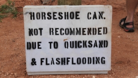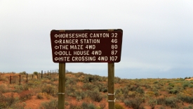 À une bifurcation, un panneau du BLM nous informe que Horseshoe Canyon n’est pas tout à fait recommandé comme but de balade en famille. OK, ça c’est dit !