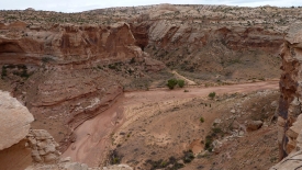 Nous partons en direction de Goblin Valley mais obliquons sur la gauche (vers l’est), pour emprunter une piste interminable sur près de 40 miles, qui doit nous conduire au départ du sentier qui permet de descendre dans Horseshoe Canyon.