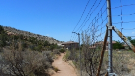 Le sentier, à proximité du parking, longe une zone résidentielle. Est-ce pour s’assurer que les hordes de hikers malpropres et malodorants ne dérangent pas les bourgeois de Grand Junction, qu’il faut une clôture et du barbelé, type prison ? Charmant…