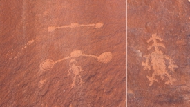 En haut d’un bloc de rocher très fin et inaccessible, des formes anthropomorphiques. Elles ressemblent énormément à des formes que nous connaissons, comme par exemple, celles rencontrées au Big Man Panel.