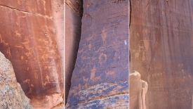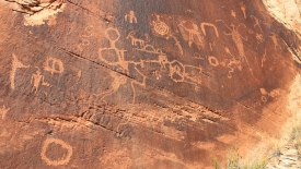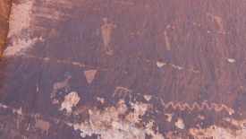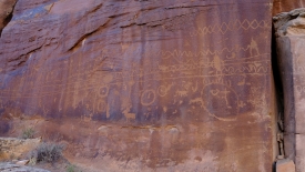 Nous partons vers Needles mais nous arrêtons bien avant, à Indian Creek. Ça fait des années que nous savons qu’il y a des pétroglyphes mais nous n’avons jamais pris le temps de nous y arrêter, toujours pressés d’arriver à Needles pour soit y planter la tente, soit aller nous balader dans ses paysages magnifiques.
