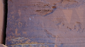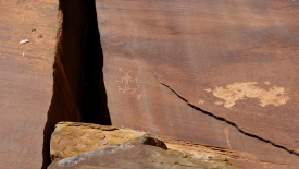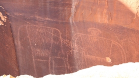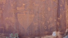 Pourquoi inhabituel ? Car là, ces formes ne sont pas gravées dans la roche par le pecking habituel mais dessinées par le frottement d’une pierre. Nous commençons par les qualifier de plagiat et à les attribuer à un abruti des temps modernes. Mais en regardant bien (enfin, elles sont à 10 mètres de haut), nous décidons qu’elles sont originales. Il y a aussi cet impact de balle qui nous fait pencher vers l’authenticité. Les cow-boys adoraient tirer sur les pétroglyphes. Et vous, qu’en pensez-vous ?