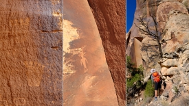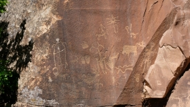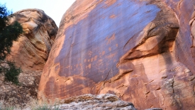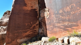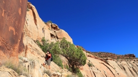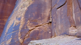 Mais aujourd’hui, nous avons deux heures ou plus à tuer. Le premier arrêt se fait à Newspaper Rock, histoire de se mettre dans l’ambiance et surtout de chausser nos chaussures de randonnée. C’est qu’il va falloir grimper à la base des falaises rouges d’Indian Creek, mondialement connues par les fanatiques d’escalade.
