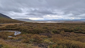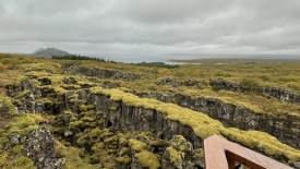 Nous arrivons en vue de Þingvellir. Þingvellir est un parc national, une grande plaine entourée de montagnes d’environ 1’000 mètres d’altitude.