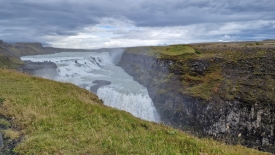 Et voici Gullfoss, la « chute d’or ». Certains avancent qu’elle tire son nom des arcs en ciel qui se développent lorsque le soleil est présent. Aujourd’hui, aucun risque ! Moi, je préfère une autre théorie, issue d’une légende. Un riche fermier, Gygur, ne pouvait supporter l’idée qu’à sa mort son or changerait de main. Il préféra jeter son coffre-fort dans la cascade avant de trépasser. Il aurait mieux fait de l’enterrer et de dire à ces enfants de ne pas vendre les terres familiales à cause d’un trésor caché dedans… La suite est bien connue, de même que la morale de la fable.