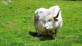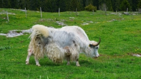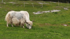 Les yaks sont là. Quelles bêtes étranges ! Même si elles nous regardent d’un œil pas forcément très amical, nous restons un long moment à les contempler, une des bêtes étant plus particulièrement patiente et presque immobile.
