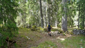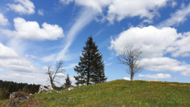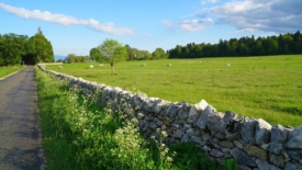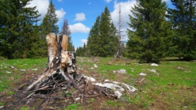 Le sentier nous promène dans un pâturage où toutes les souches d’arbre ont été brûlées.