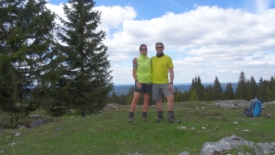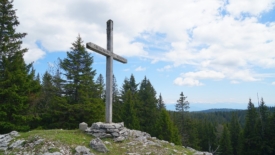 Stefano a mentionné le Crêt des Danses et je suis toute surprise d’y arriver sans passer par la case « montée assassine ». Chemin faisant, nous dépassons deux jeunes aux vélos lourdement chargés, en train de les pousser. Ils ne sont pas certains de l’endroit où ils sont. Nous les aidons à se localiser sur leur carte qui, à cet endroit même, indique « mauvais chemin ». Ah, pour être un mauvais chemin à vélo, s’en est un ! Nous les laissons partir et arrivons à la croix du Crêt des Danses.