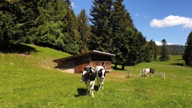 Au Couvert des Prés d’en Haut, nous avons droit à un accueil chaleureux de la part des génisses qui, pourtant bien à l’abri à l’intérieur du couvert, n’hésitent pas une seconde à en sortir pour venir vers nous.