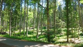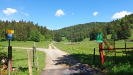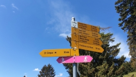 En allant tout droit, nous rejoindrions la route principale au niveau du chalet Les Bioles. Nous, nous allons sur la gauche, vers le Pré Nouveau. Ce qui nous permet, entre autre, d’éviter de passer à proximité des vaches et de leurs petits veaux.