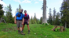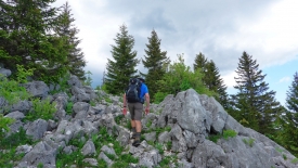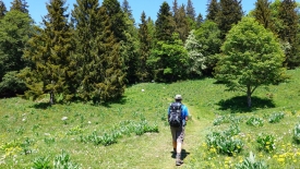 C’est en fait Christian, le berger du troupeau de mouton, troupeau qui devrait arriver la semaine prochaine. 400 bêtes nous dit-il. Là, il prépare le terrain : il coupe les branches basses des sapins, ramasse les branches tombées durant l’hiver, déplace des cailloux, bref élimine tout ce qui serait susceptible de blesser une brebis. Nous lui racontons notre rencontre avec son troupeau et les chiens l’année passée, rencontre qui nous a laissé un souvenir amer. Nous l’avions vu de loin et il n’avait rien fait pour calmer les chiens. Il nous parle de la vie de berger, de sa rudesse, de la manière dont il déplace les moutons, … C’est un monsieur d’une quarantaine d’année, tout sec, au regard clair et tranquille.