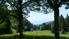 Nous passons l’immense pâturage du Communal de l’Abbaye avant d’arriver au Crêt à Pétaud, que nous appelons plutôt “Crêt aux Vaches Menaçantes” (il y avait aussi un taureau, mais il était occupé à faire de l’exercice …).