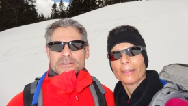 Un couple, souriant, qui répond du tac au tac : « Quel accueil ! ». Nous engageons la conversation. Ils sont à ski, ces skis de back country dont nous parlions dans un billet précédent. Stefano leur offre une Clif Bar pour se faire pardonner. En retour, nous avons droits à un autoportrait.