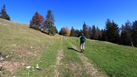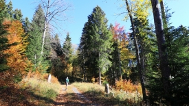 Nous rejoignons tant bien que mal la route qui mène au Pré de St-Livres, route que nous suivons sur quelques centaines de mètres. Puis vient une piste forestière, confortable et à la pente douce. Nous marchons à flanc de montagne, parallèlement au Pré de St-Livres, éloigné de 500 mètres environ.