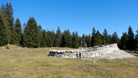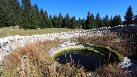 Nous arrivons près des ruines du Chalet de Sous La Roche. Il n’en reste vraiment pas grand chose. Quelques pierres dessinant un vague rectangle et la citerne, d’une capacité de 35’000 litres.