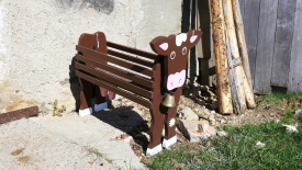 J’ai un coup de foudre pour le banc. En premier lieu j’ai pensé que la pluie et le vent l’avait abîmé. Mais non, il a été peint imitation vache. Comme le premier snowboard de Luana, qui mesurait à peine 95 cm.