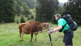 Une vache, en mal de caresse, vient vers Stefano qui est tout content de ne pas avoir à supplier pour avoir une léchouille.