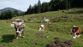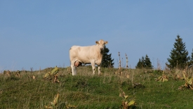 Dans un pré, coincé entre un coude de la route, des vaches dont une vache grise. Les plus belles.