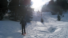 La descente vers le chalet des Apprentis se fait en dévers… et donc contrairement à ce que j’ai écrit précédemment, oui, la descente en dévers est possible pour un être humain ayant les deux jambes de la même taille… A condition de n’avancer pas trop vite et de poser un pied devant l’autre, sur une même ligne, ce qui avec des raquettes aux pieds n’est pas gagné d’avance.