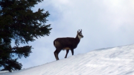 Deux chamois profitent de la fonte des neiges pour racler quelques pierres à nu en quête de nourriture.