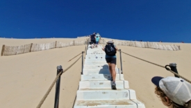 Une fois enfilés nos chaussures de marche, nous suivons le petit chemin qui mène jusqu’au pied de la dune, où nous trouvons un escalier, installé afin de faciliter l’ascension vers le sommet. Nous avons lu sur le site officiel, que tous les ans l’escalier de la dune du Pilat est monté au printemps, puis démonté après la Toussaint, afin d’éviter son ensablement total durant l’hiver. Le nombre de marches varie entre 130 et 160, en fonction de la hauteur de la dune, qui change au fil des années.