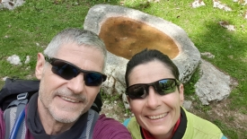 Il s’en faut d’un cheveu pour que nous abandonnions, la faute à l’absence de réseau. C’est en passant le mur qui marque l’entrée du pâturage du Croue que Stefano consulte encore une fois son GPS. Le point s’affiche enfin. Une trace part dans la bonne direction. Un cairn sur un vieux mur. Je la vois la première, en contrebas, dans une petite zone dégagée.