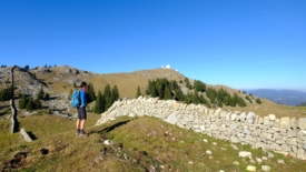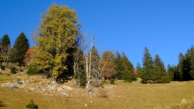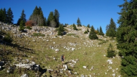 La montée se poursuit, dans les pâturages où sont éparpillés quelques arbres. Certains endroits sont rocailleux et le contraste du calcaire sur l’herbe, même sèche, est très esthétique.