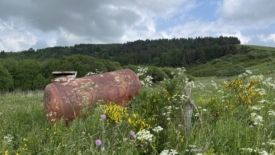Nous devons d’abord rejoindre le petit village de Saulzet le Froid, sans autre option que de marcher au bord de la route. Pour la première fois depuis notre arrivée en Auvergne, nous avons un peu chaud, grâce au goudron qui réverbère la chaleur du soleil.