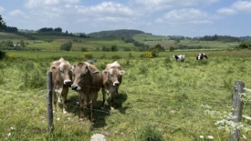 Ce n’est qu’une petite départementale où nous rencontrerons plus de tracteurs que de voitures ou motos. Faux, pardon… j’oubliais le bétail qui délaisse momentanément la pâture pour s’approcher de la clôture. Au fond de la photo ci-dessous, le puy de l’Enfer.