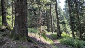 Le sentier qui mène au puy de Monténard est un peu plus au sud et balisé de bleu. Il s’élève tout doucement dans la forêt où il fait encore frais.