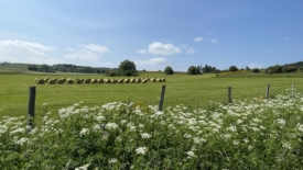 Ici, les prés sont fauchés et les balles de foin joliment alignées.